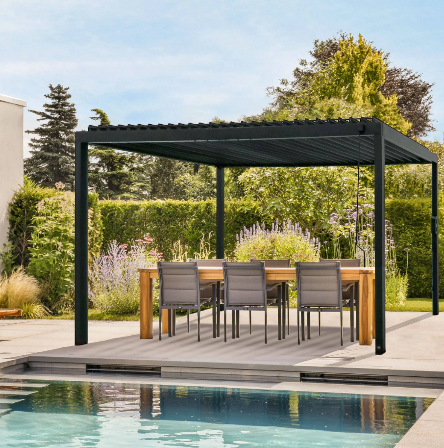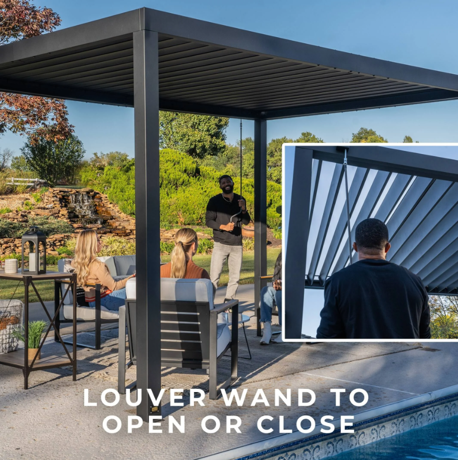 The defining feature of this model is its adjustable louvered roof system, which allows you to control sunlight, airflow, and shade with a simple motion. Whether you want full sun, partial shade, or complete rain protection, this pergola adapts instantly—making it perfect for all-season outdoor living.