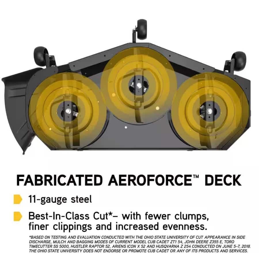 - Equipped with an 11-Gauge 50 in. fabricated triple-blade aeroforce deck (high lift) deck with reinforced leading edges that results in finer clippings, fewer clumps, reduced stragglers and increased evenness, protected by the Cub Cadet triple guard corrosion defense system with e-coat and a lifetime warranty
