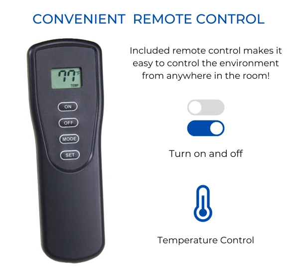 - Thermostat Remote Control Included – This remote controlled unit allows you to set your desired heat temperature and control your log set by using the included remote control. (System Requires 4 AA and 2 AAA Batteries – Included)