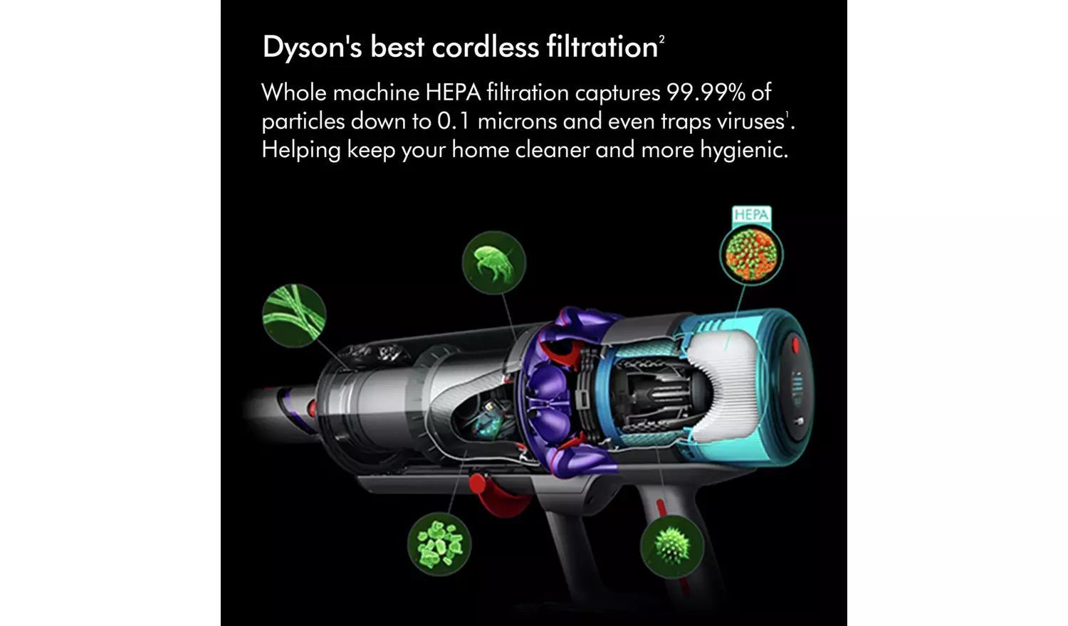 Dyson’s best cordless filtration even traps viruses. Whole-machine HEPA filtration system captures dust and seals in 99.99% of microscopic particles and allergens and even traps viruses – expelling cleaner air into your home.