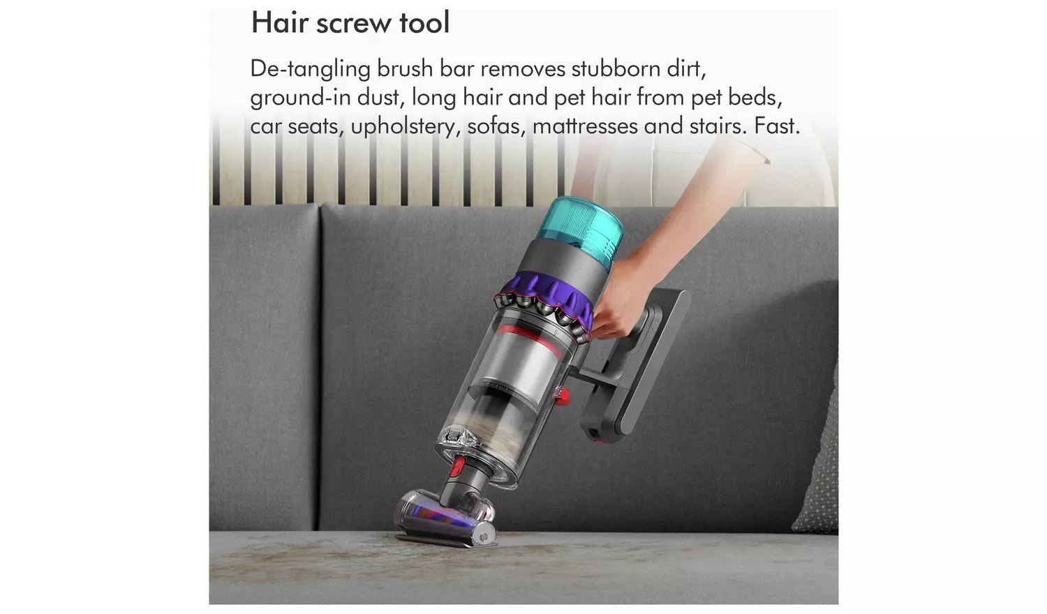 De-tangling Digital Motorbar cleaner head sucks up dirt, dust and hair from all floor types – intelligently adapting suction power from carpets to hard floors. Stiff nylon bristles clean deep into rugs and carpets to remove ground-in dirt.