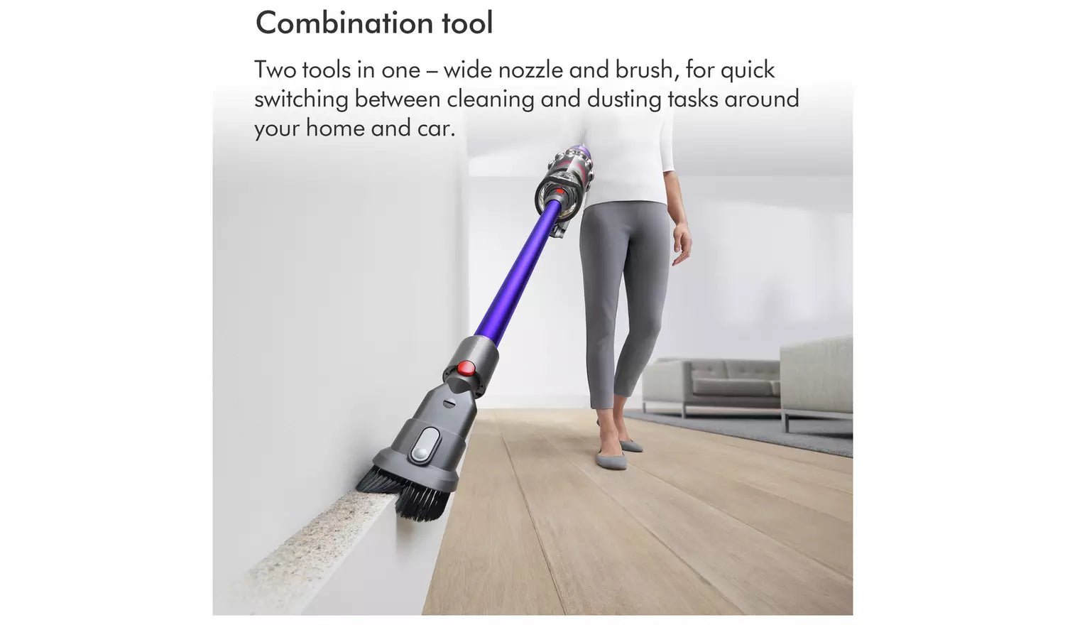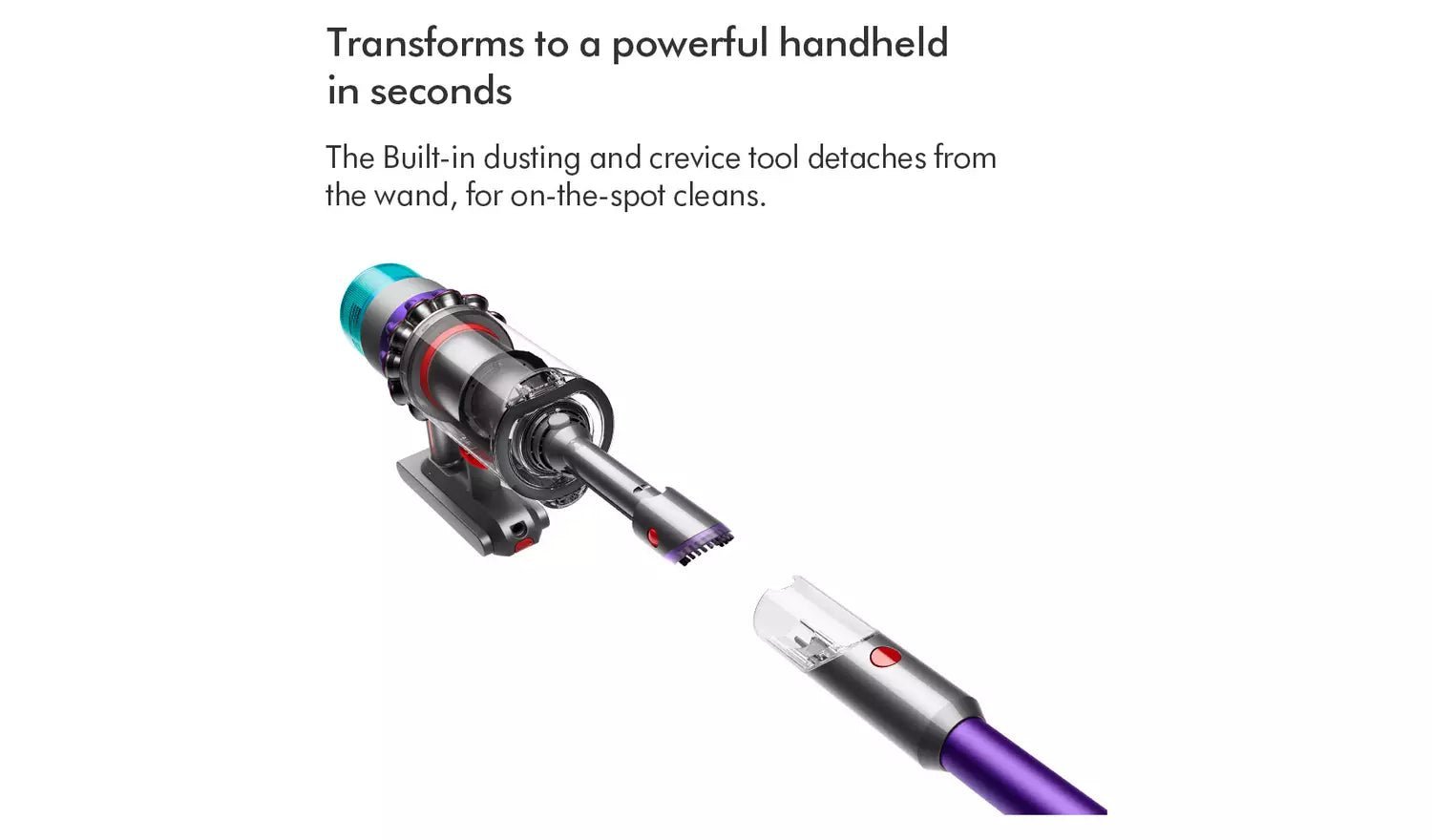 Single-button power control – for easier cleaning. Effortlessly reaches down low into hard-to-reach, narrow spaces. Built-in dusting and crevice tool detaches from the wand transforming this vacuum into the most powerful handheld in seconds.