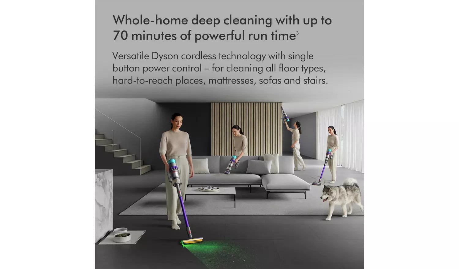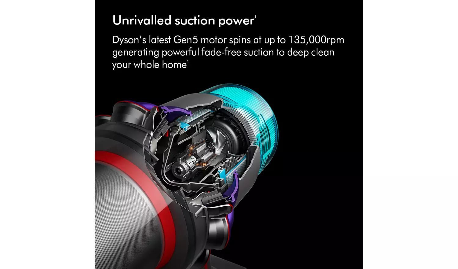 Dyson Gen5detect Absolute Cordless Vacuum. The most powerful HEPA cordless vacuum1. And de-tangling technology. Engineered for homes with pets. New Gen5 motor spins at up to 135,000rpm generating the most powerful suction. Dyson’s longest ever runtime in a cordless vacuum delivers up to 70 minutes of fade-free power to deep clean your whole home. Root cyclone technology captures dust and debris from the airflow with no loss of suction. Maintaining maximum suction power.