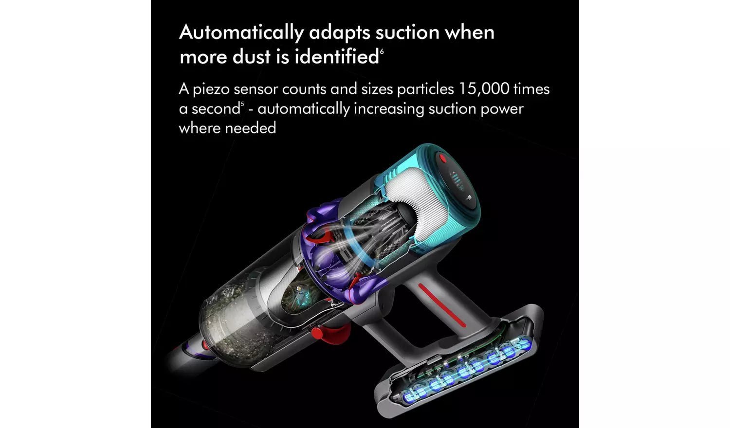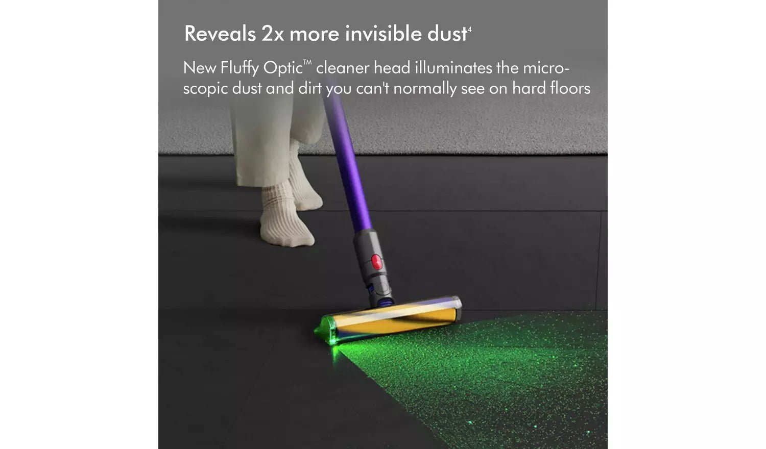 Two cleaner heads to deep clean anywhere. New Fluffy Optic cleaner head illuminates the microscopic dust and dirt you can’t normally see on hard floors – revealing 2x more invisible dust.
