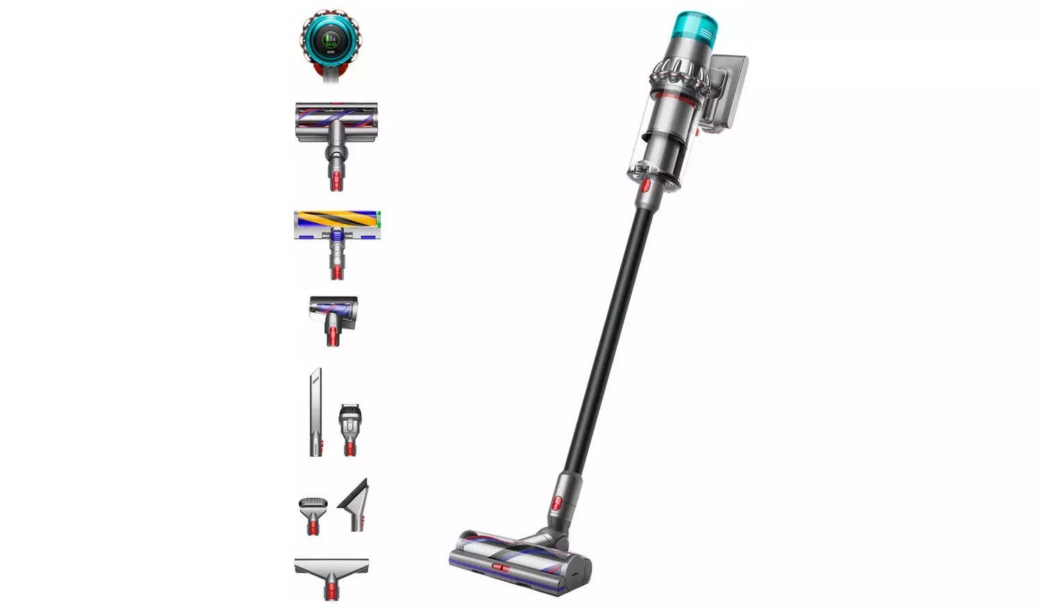 • Includes wall dock charger, soft dusting brush, stubborn dirt brush and de-tangling digital motorbar cleaner head, fluffy ptic cleaner head, hair screw tool, mattress tool, combination tool, crevice tool.