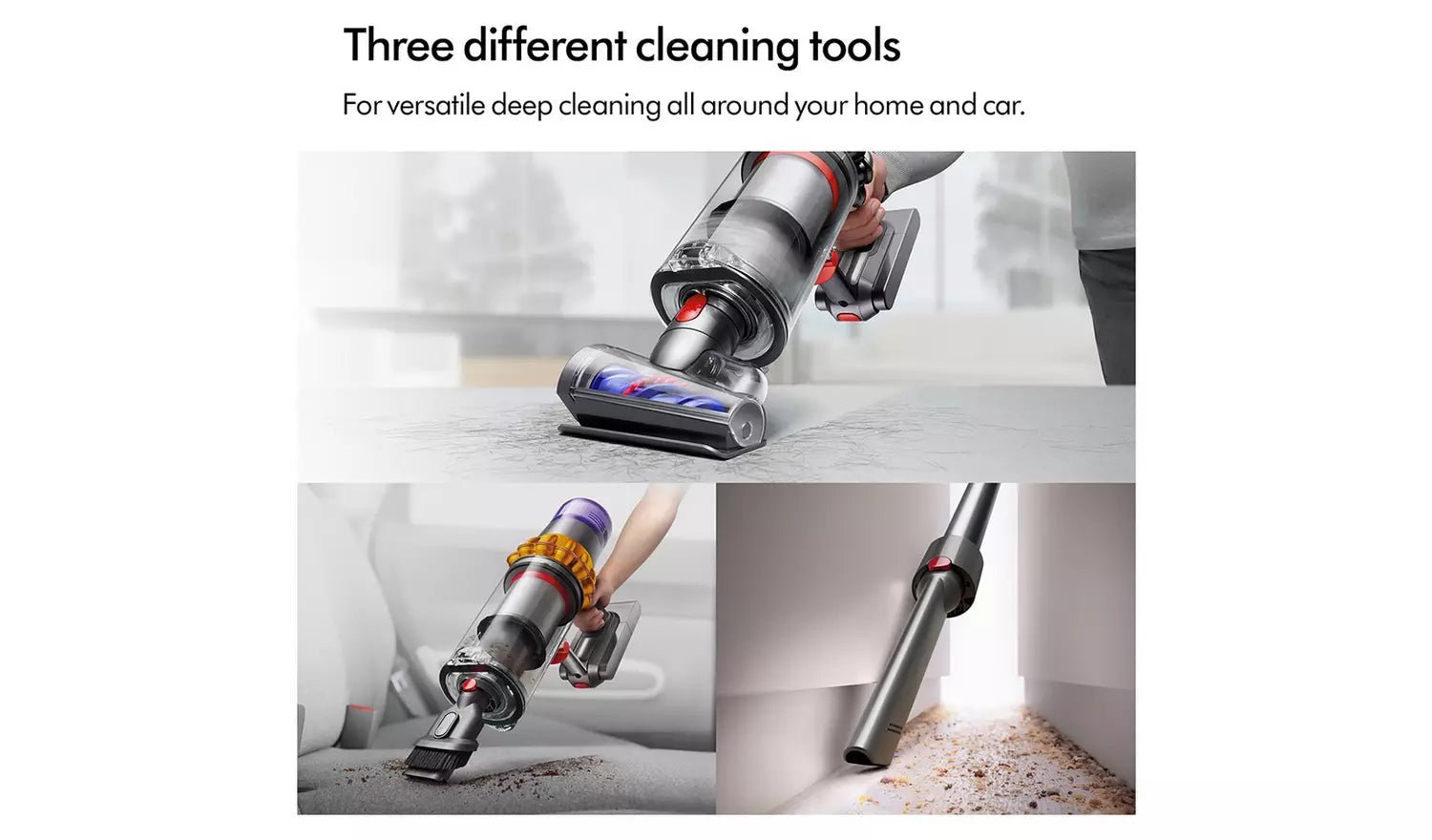 yson V15 Detect Total Clean Cordless Vacuum. Powerful. Intelligent. Versatile. For whole-home deep cleaning. With de-tangling technology. Engineered for homes with pets. With advanced whole-machine HEPA filtration and three additional tools to clean even deeper all around your home and car.