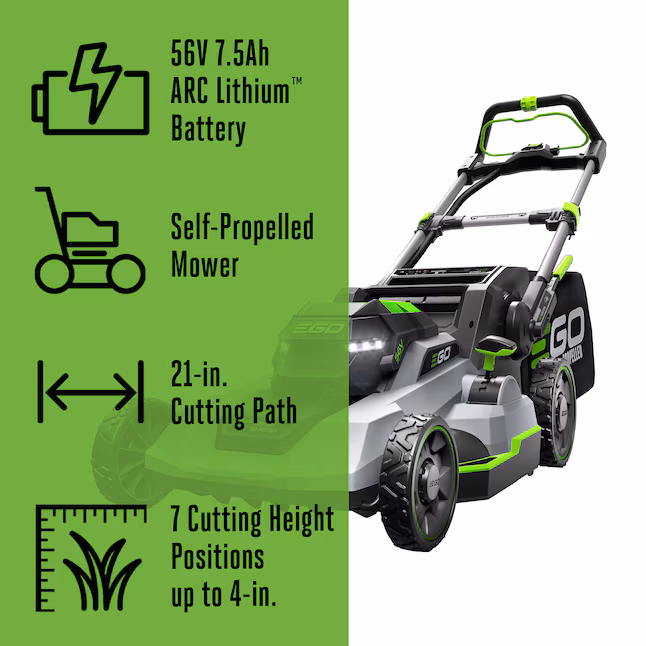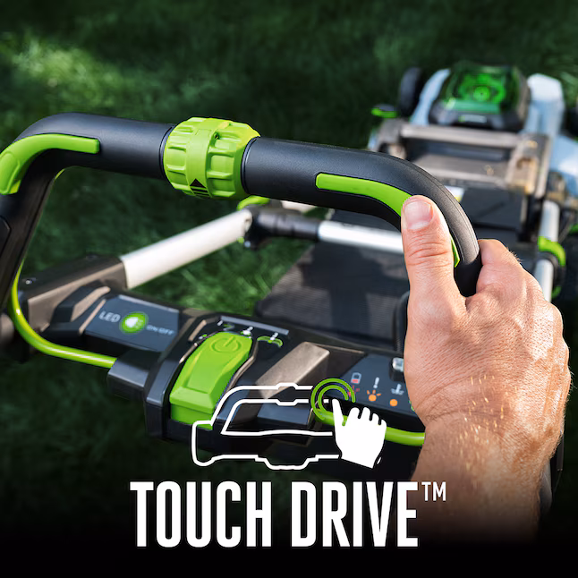 The EGO POWER+ 21” Self-Propelled Mower with Touch Drive™ delivers 6.0 foot-pounds of cutting torque—power that exceeds gas without the noise, fuss, or fumes. Touch Drive™ technology puts complete control of the self-propelled system in the palm of your hands by using pressure to engage the system. Easily control the variable speed with a dial positioned at your fingertips for safe and convenient operation. This cordless lawn mower delivers up to 60 minutes of run time on a single charge with the included 56V ARC Lithium™ battery. The electric lawn mower delivers precision cutting with its advanced mulching blade and seven cutting height positions from 1.25 to 4 inches, adjustable with one hand. Three-in-one functionality delivers your choice of mulching, side discharge, or bagging your grass clippings; an easy-access two-bushel grass collection bag is included. This self-propelled lawn mower includes bright LED lights for added visibility when mowing at dawn or dusk, and it folds flat for compact storage between cuts. Experience Power Beyond Belief™ with the EGO POWER+ 21” Self-Propelled Lawn Mower with Touch Drive™.