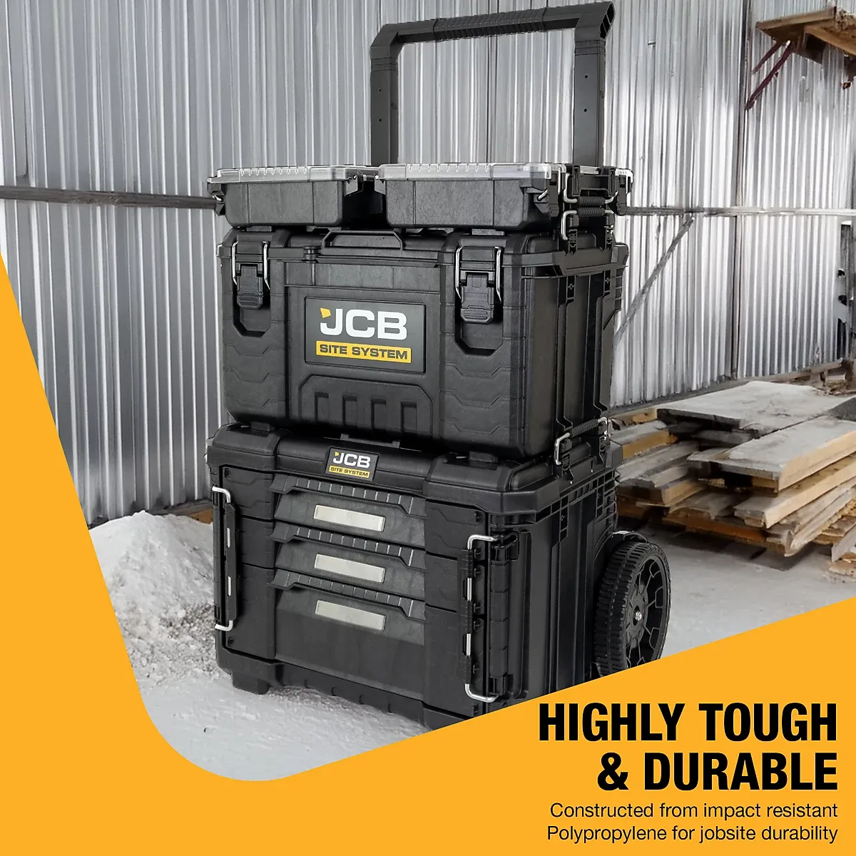 The JCB Site System 5-Piece Tool Storage Set is a heavy-duty, modular storage solution designed for professionals who need durable, organized, and mobile tool storage on demanding job sites. Built to withstand tough working conditions, this complete system includes multiple interlocking toolboxes and a robust cart/trolley, allowing tools and accessories to be transported securely and efficiently.