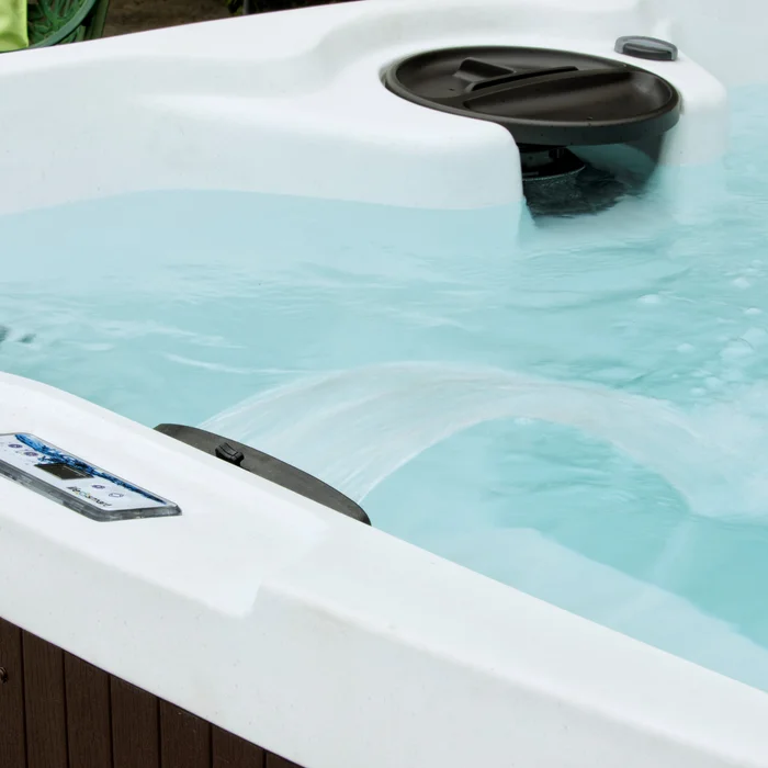 Designed to accommodate up to six adults with ergonomically contoured seating, including a full-body lounge seat for added relaxation. - Waterfall Feature