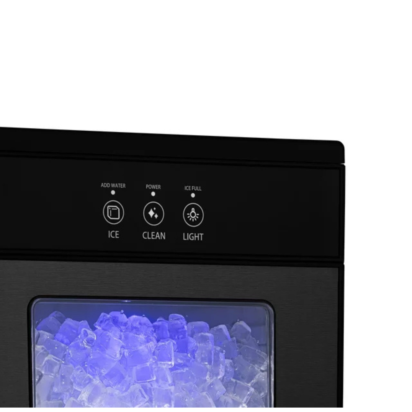 Features drawer-style access, a clear viewing window, and a cool blue LED light to showcase the ice. The modern design complements any kitchen, bar, or entertainment space.