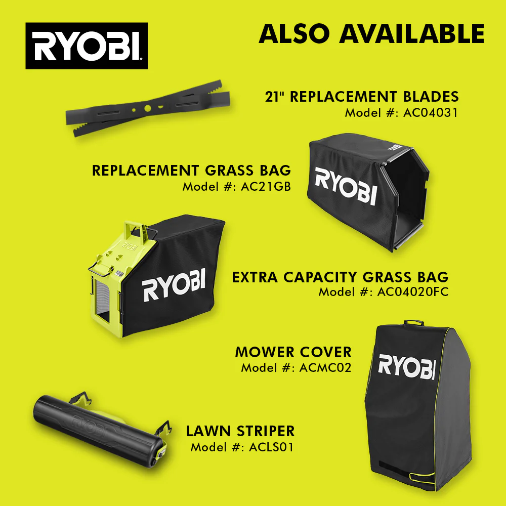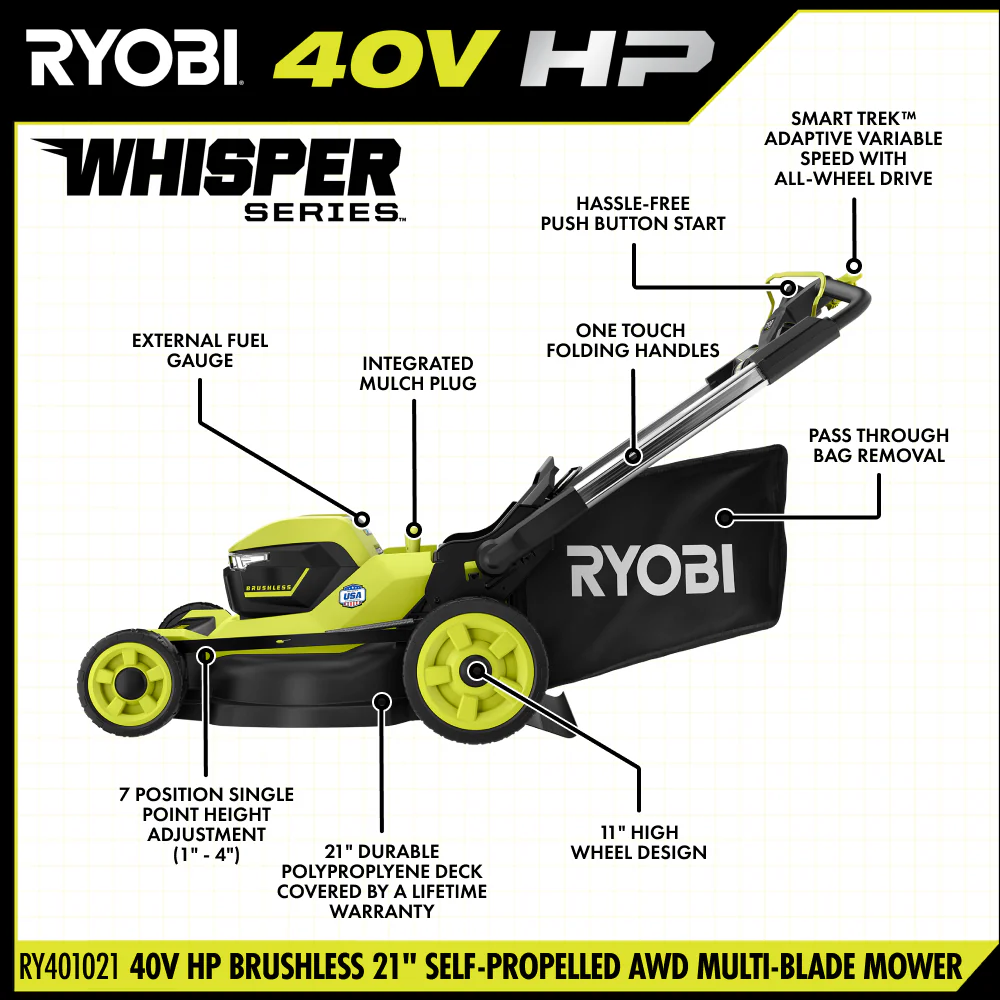 - (1) RY401012 – 40V HP BRUSHLESS 21″ SELF-PROPELLED AWD MULTI-BLADE MOWER