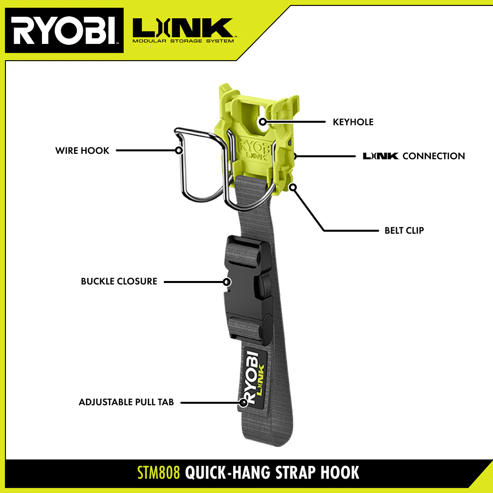 The RYOBI LINK Modular Storage System is revolutionizing the storage industry, enabling you to Organize, Access and Transport your life. The RYOBI LINK Quick-Hang Strap Hook offers four versatile hanging options, keeping cords, wires, tape, hoses, rope and more within reach. Designed for maximum convenience, its sturdy belt clip and wire hook attach effortlessly to belts, tool bags, 2-by lumber, ladders and more. Store on your LINK Wall Rail, or place it directly on a screw head. This strap-hook comes equipped with a buckle closure to quickly fasten your items. Use the integrated pull tab to cinch the strap, keeping your products and accessories secure. Best of all, it is part of the RYOBI LINK Modular Storage System line of products that use the same locking technology to seamlessly connect your mobile and stationary storage needs. Own your space with RYOBI LINK Modular Storage System.
