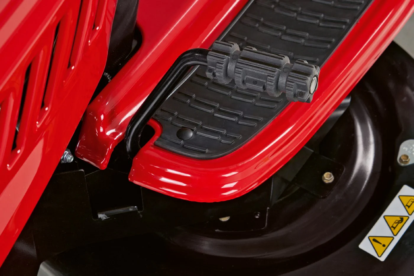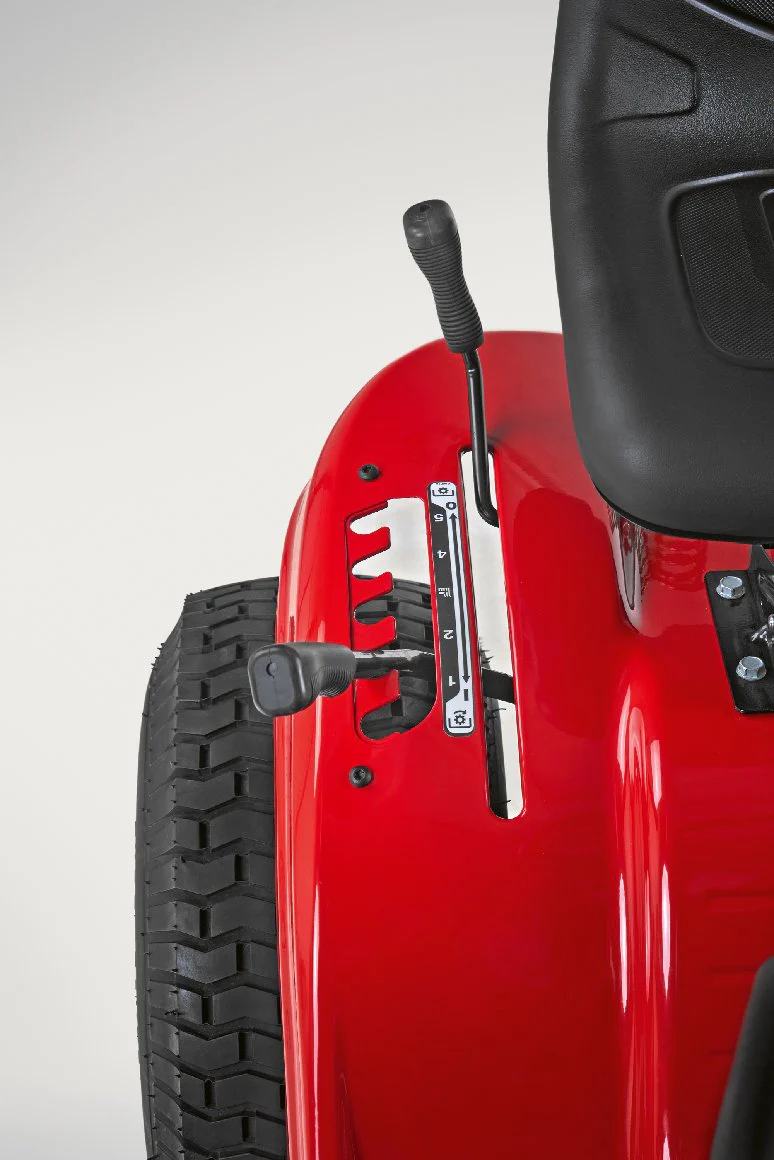 The cutting height is adjustable via a lever with five positions, ranging from approx. 30 mm to 95 mm, letting you tailor how short or long you want your lawn. The turning radius is tight for a machine of this size (around 46 cm in many specs), making it more manoeuvrable than you might expect among larger tractors.