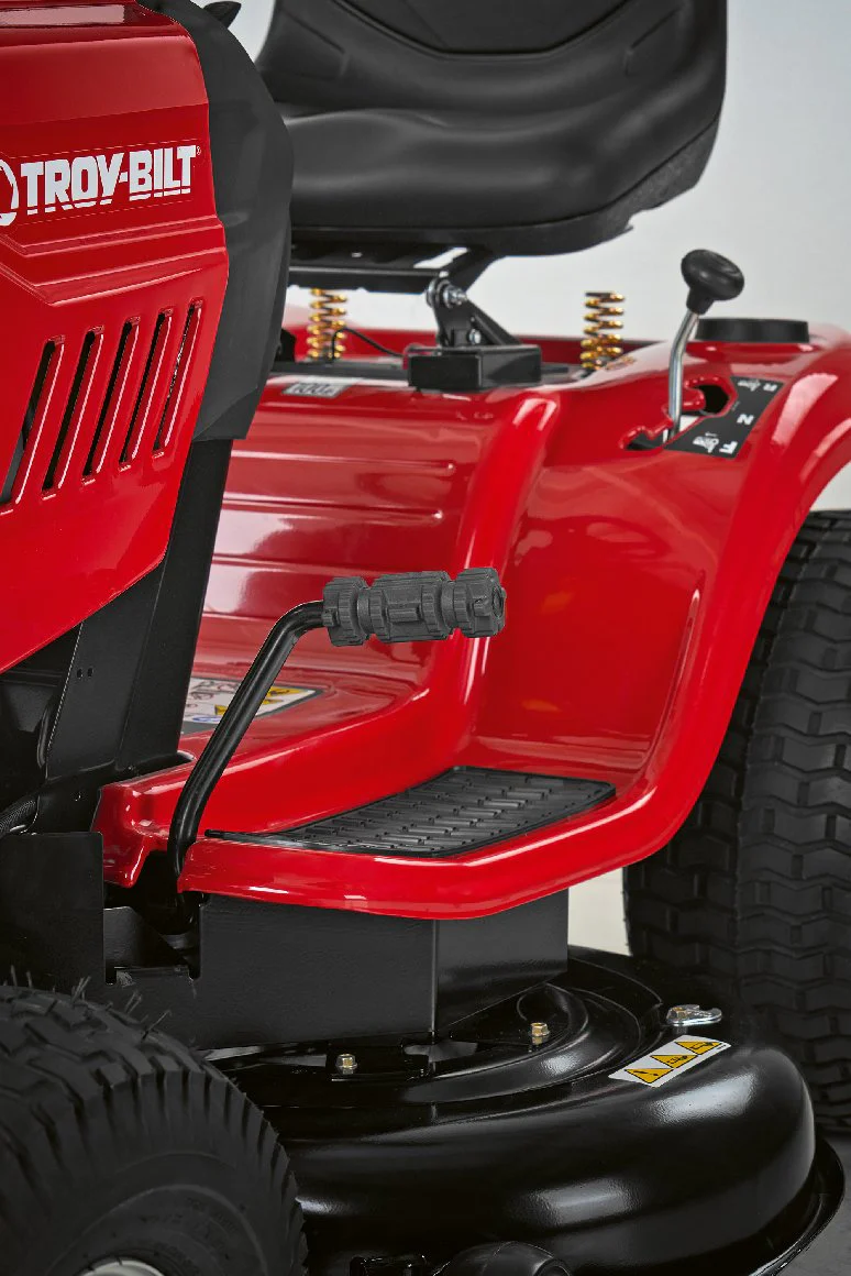 The Troy‑Bilt Bronco 107T‑S is a heavyweight ride‑on lawn tractor built for serious mowing jobs. Whether you’re dealing with a large estate, multiple acres, or challenging terrain, this machine is designed to deliver power, efficiency and versatility. It features a wide 107 cm cutting deck, which means you cover more ground per pass than standard mowers. The cutting deck supports both side‑discharge and mulching modes — so you can choose to expel clippings or finely chop them and return them to your turf for a more natural finish.