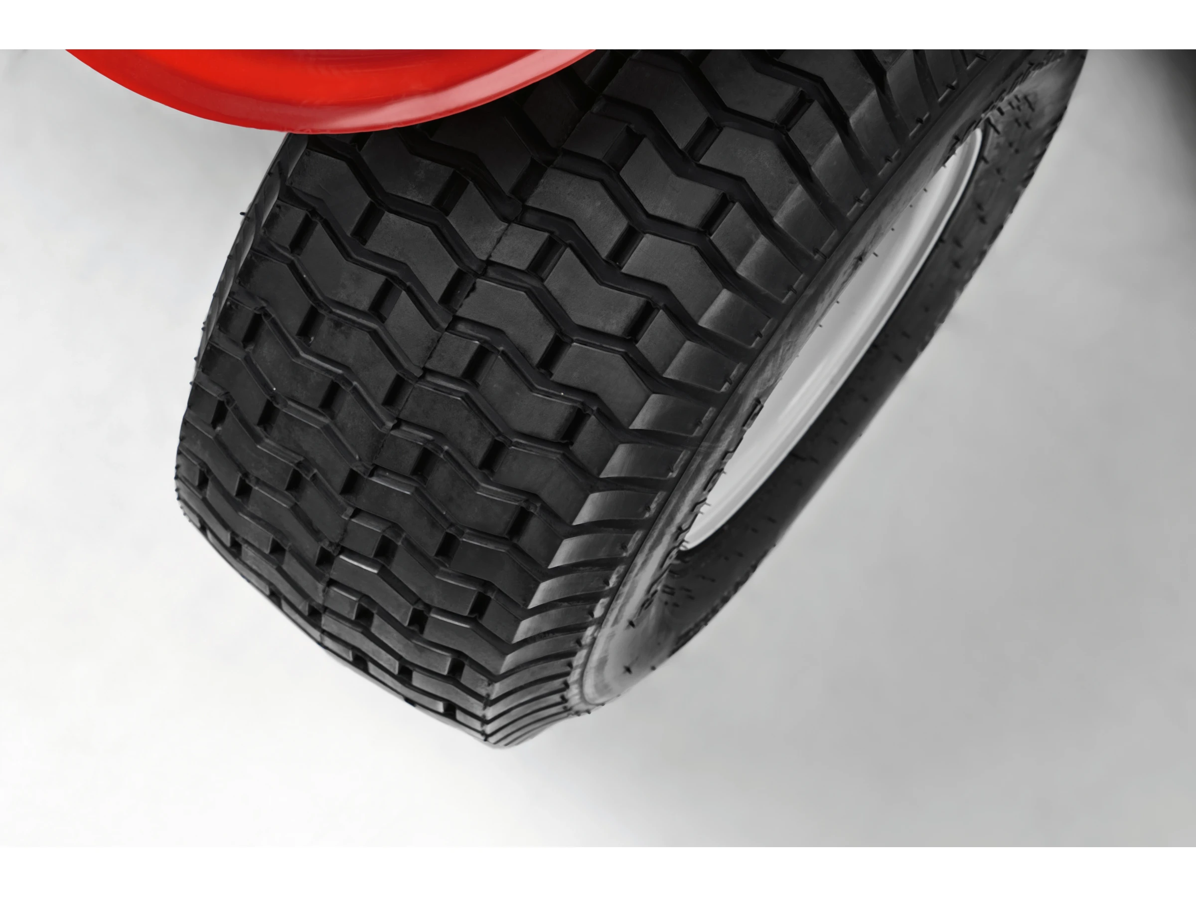 Its hydrostatic or CVT transmission allows smooth, stepless speed adjustment with foot pedals, enabling precise control in forward and reverse directions. This makes maneuvering around trees, flowerbeds, and tight spaces effortless. The tractor’s large rear tires provide excellent traction, while the reinforced front axle and steel chassis ensure durability and stability on various terrains.