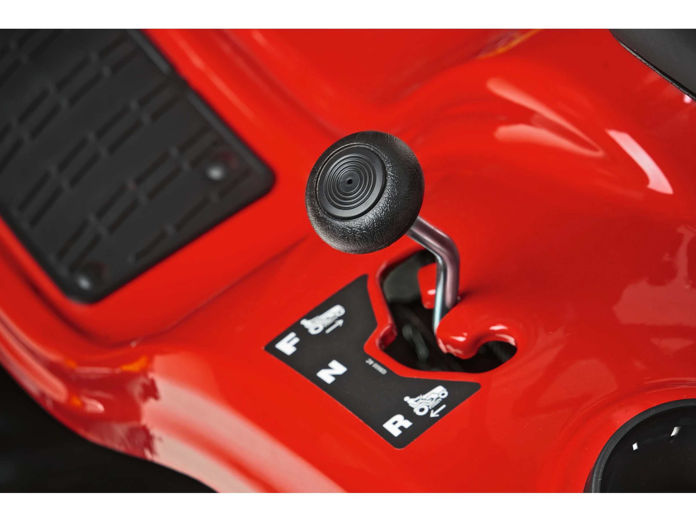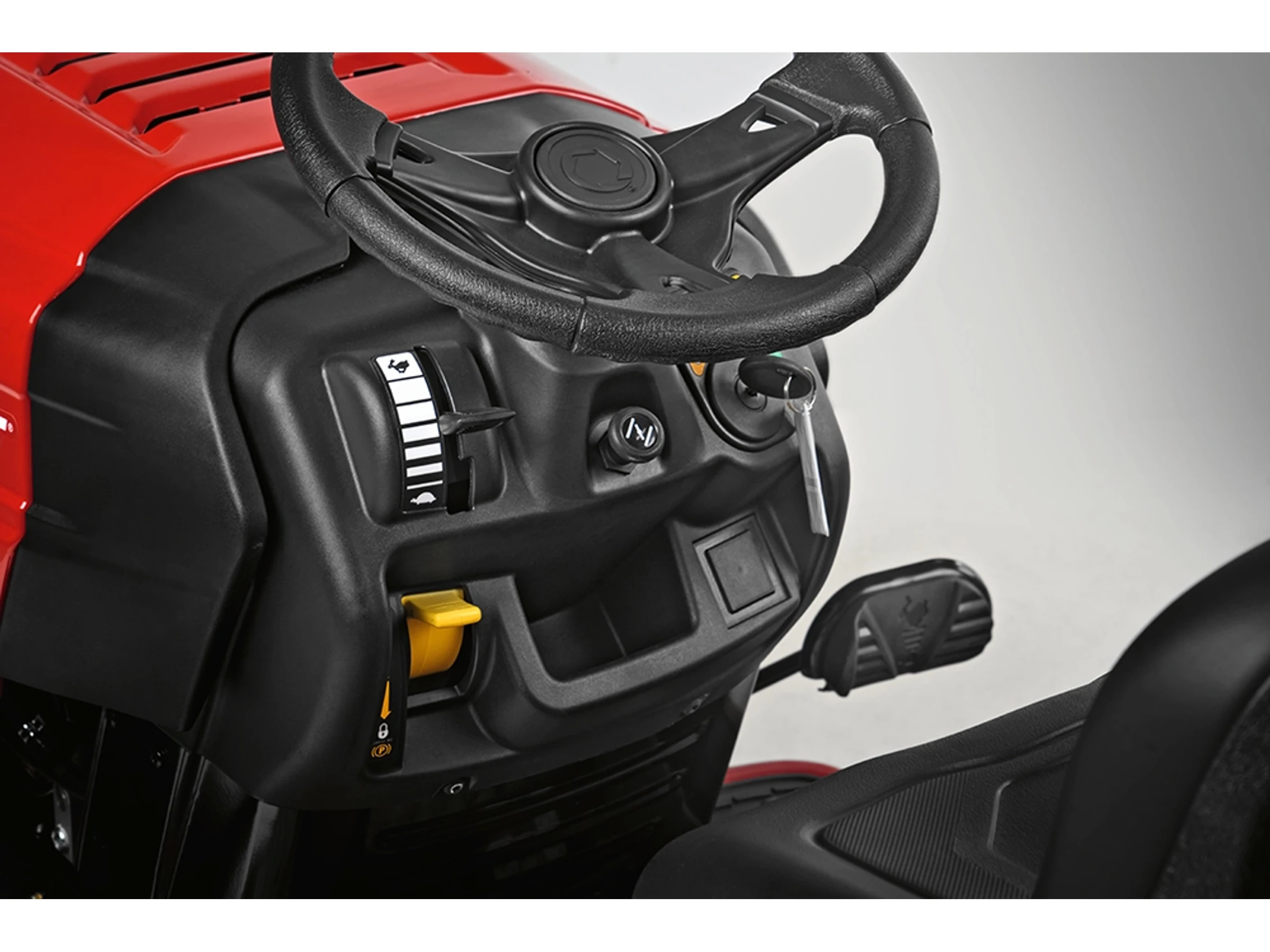 The tractor is equipped with a 107 cm (42-inch) cutting deck featuring dual blades for maximum coverage. The cutting height is adjustable from 30 mm to 95 mm, allowing homeowners to choose a short, manicured finish or a more natural turf length. It also supports side discharge and mulching modes, giving flexibility in how grass clippings are handled and enhancing lawn health.