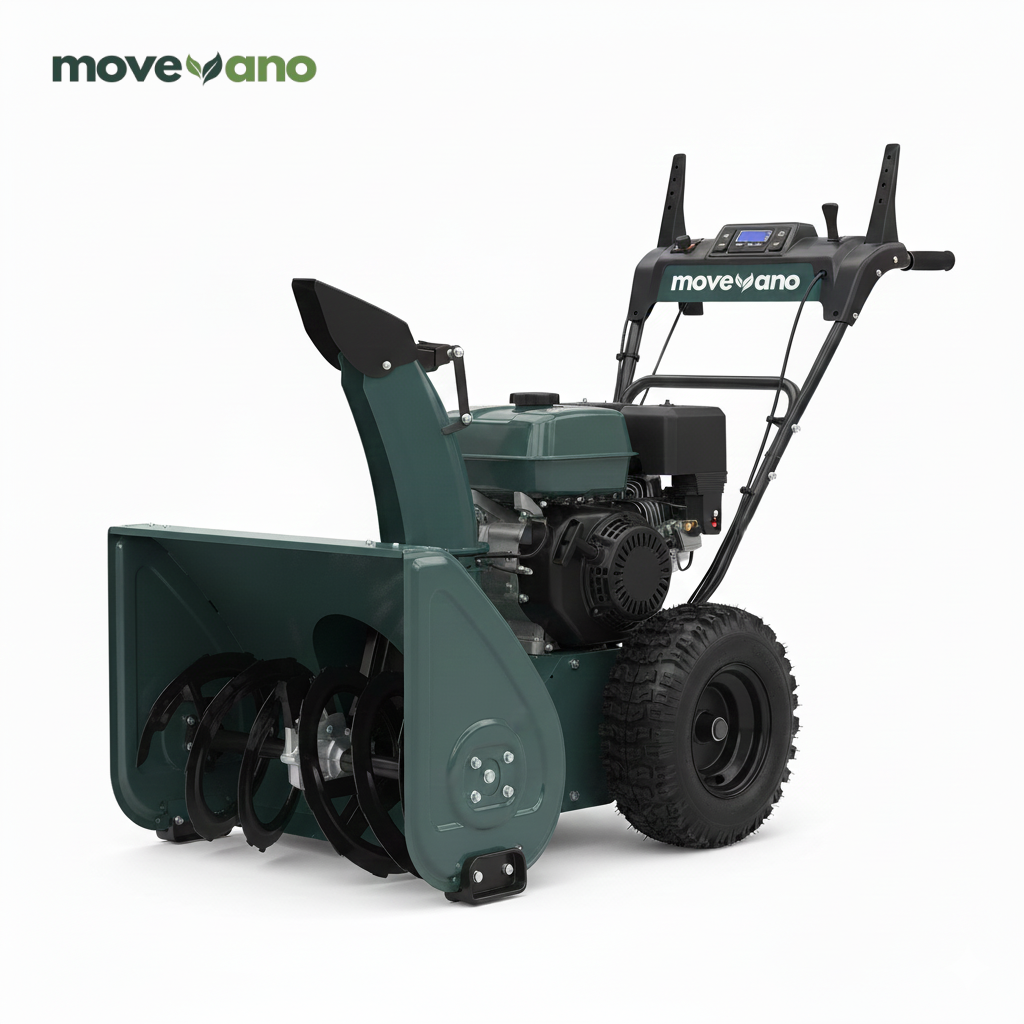 The snow blower is a heavy-duty, self-propelled machine built for clearing deep snow and ice. It utilizes a two-stage system: the first stage features a heavy-duty serrated steel auger that chews through packed snow and ice, and the second stage uses a high-speed impeller to powerfully discharge the snow through the chute. It is powered by a reliable 4-cycle OHV engine (like the Honda GX series or similar OEM versions as seen in one image) and includes a push-button electric start for easy starting in cold weather, supplemented by a standard recoil pull-start. The operator controls include a digital display for easy operation, multiple speeds (typically 6 forward/2 reverse), and a remote chute control to precisely adjust the direction and pitch of the snow discharge.