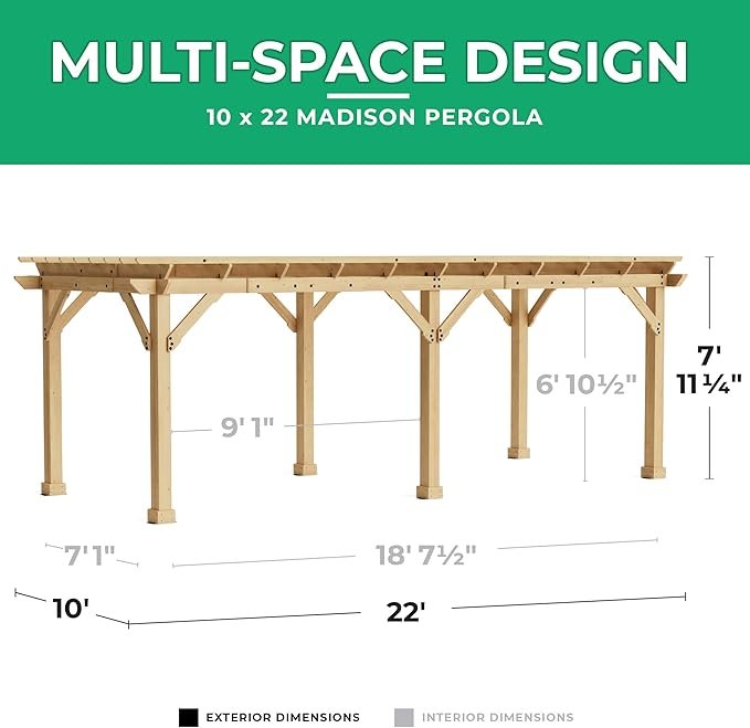 The Yardistry 10′ × 22′ Meridian Pergola is a stylish, durable, and spacious outdoor structure. Its elegant cedar design, sturdy construction, and generous shaded area make it perfect for entertaining, relaxing, or enhancing your backyard. It combines aesthetic appeal, functionality, and long-lasting performance.