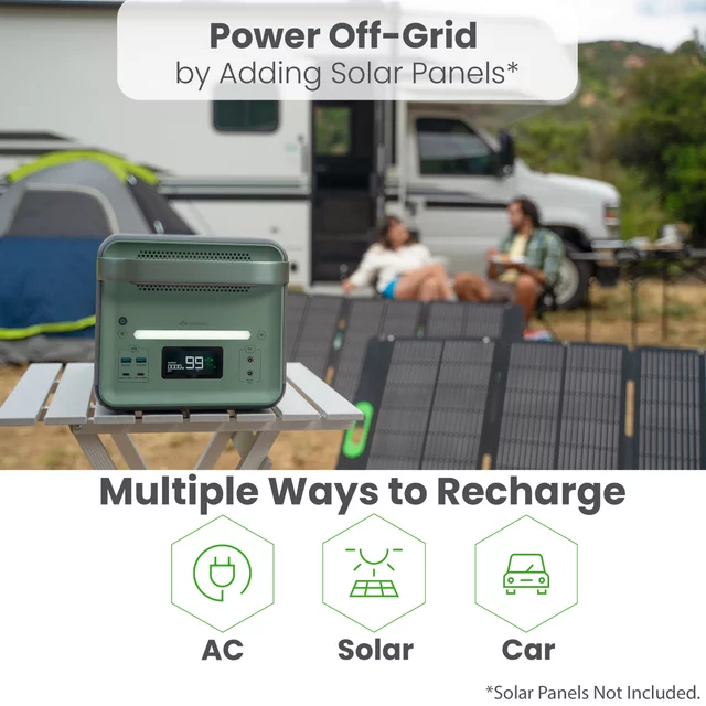 Ports include AC (pure sine wave, 120V x2, 120V/30A RV x1), DC (12V) x2, USB-A x2, USB-Type C (20W) x1, Type C PD (100W) x1, Wireless Charging Pad (15W) x2